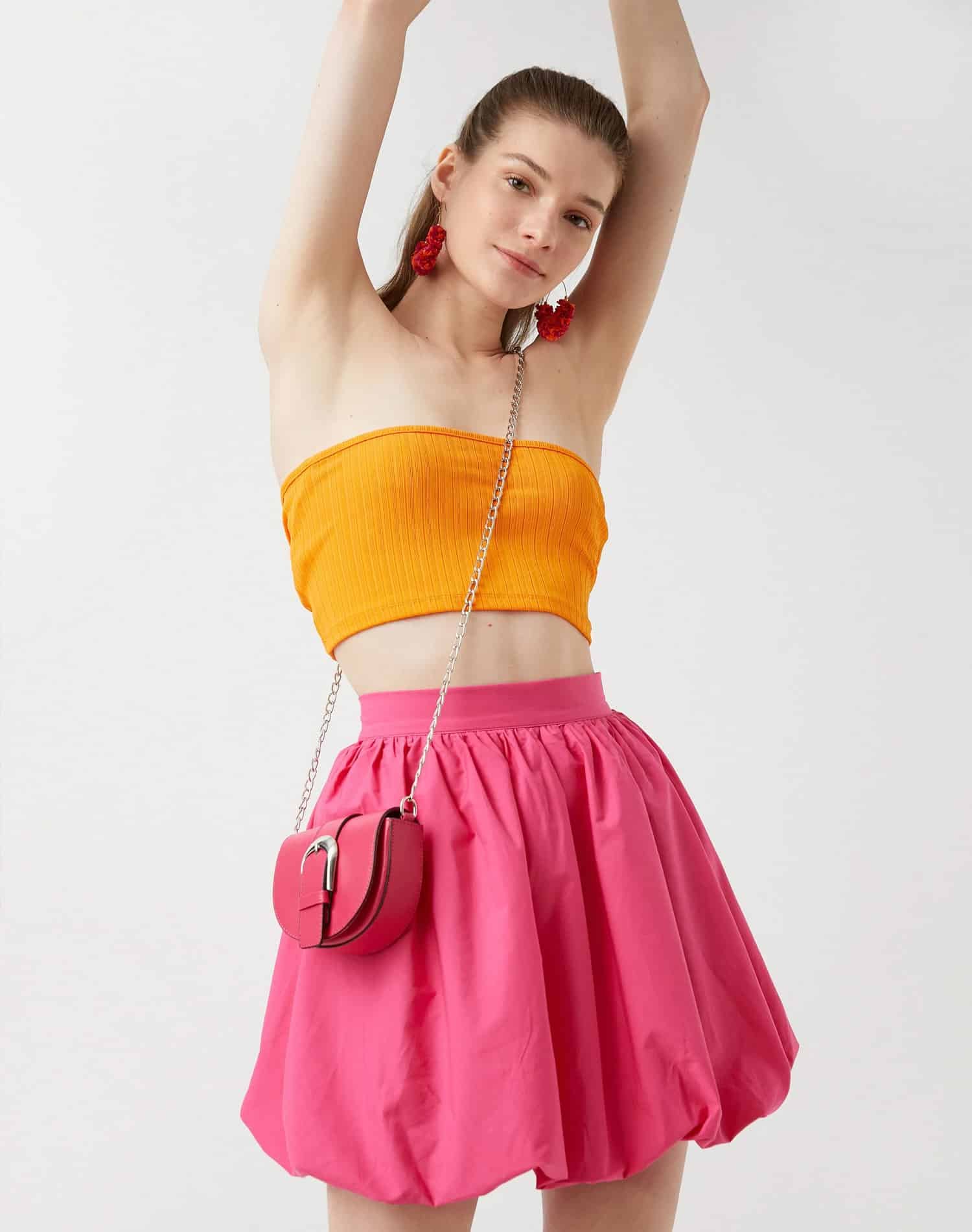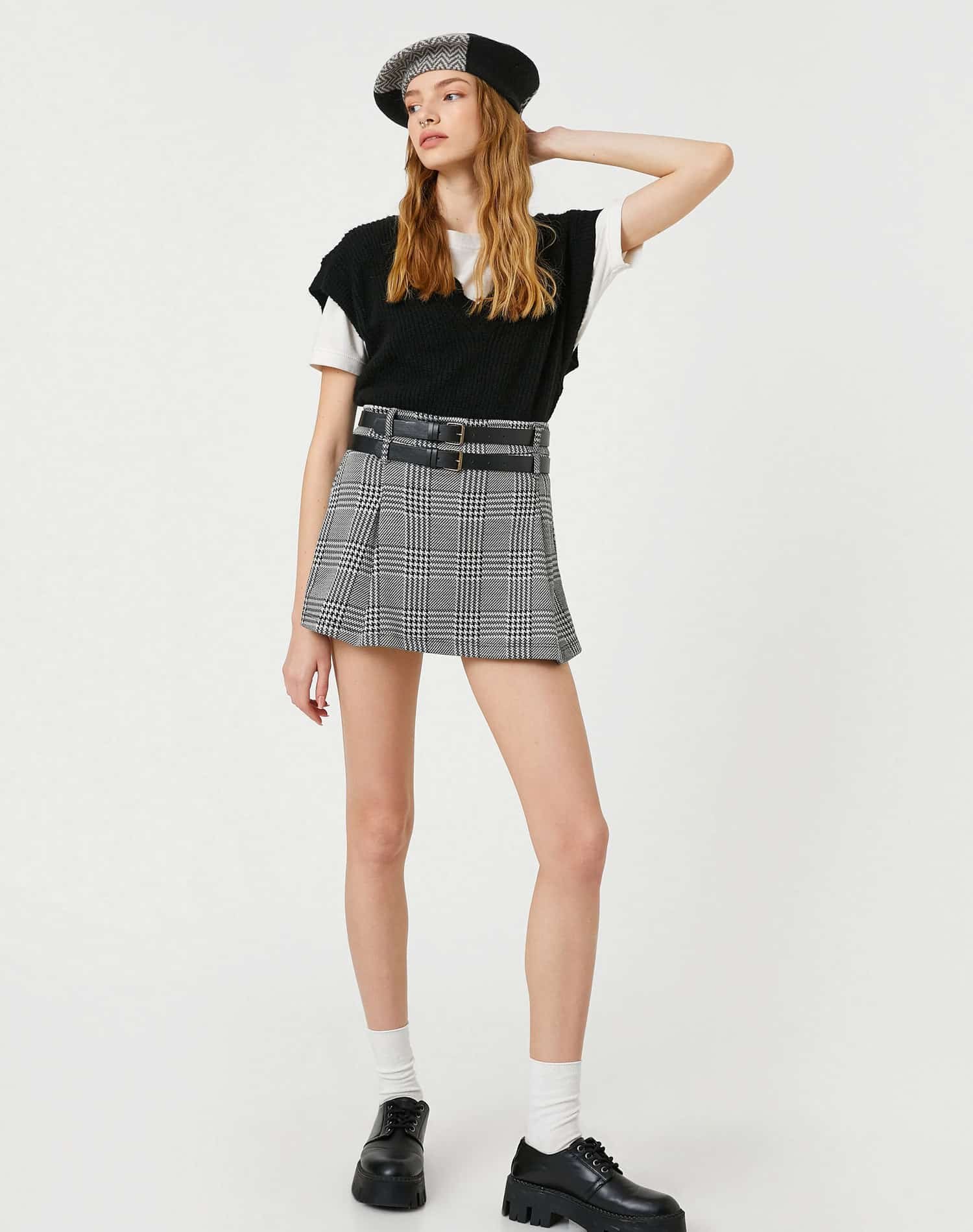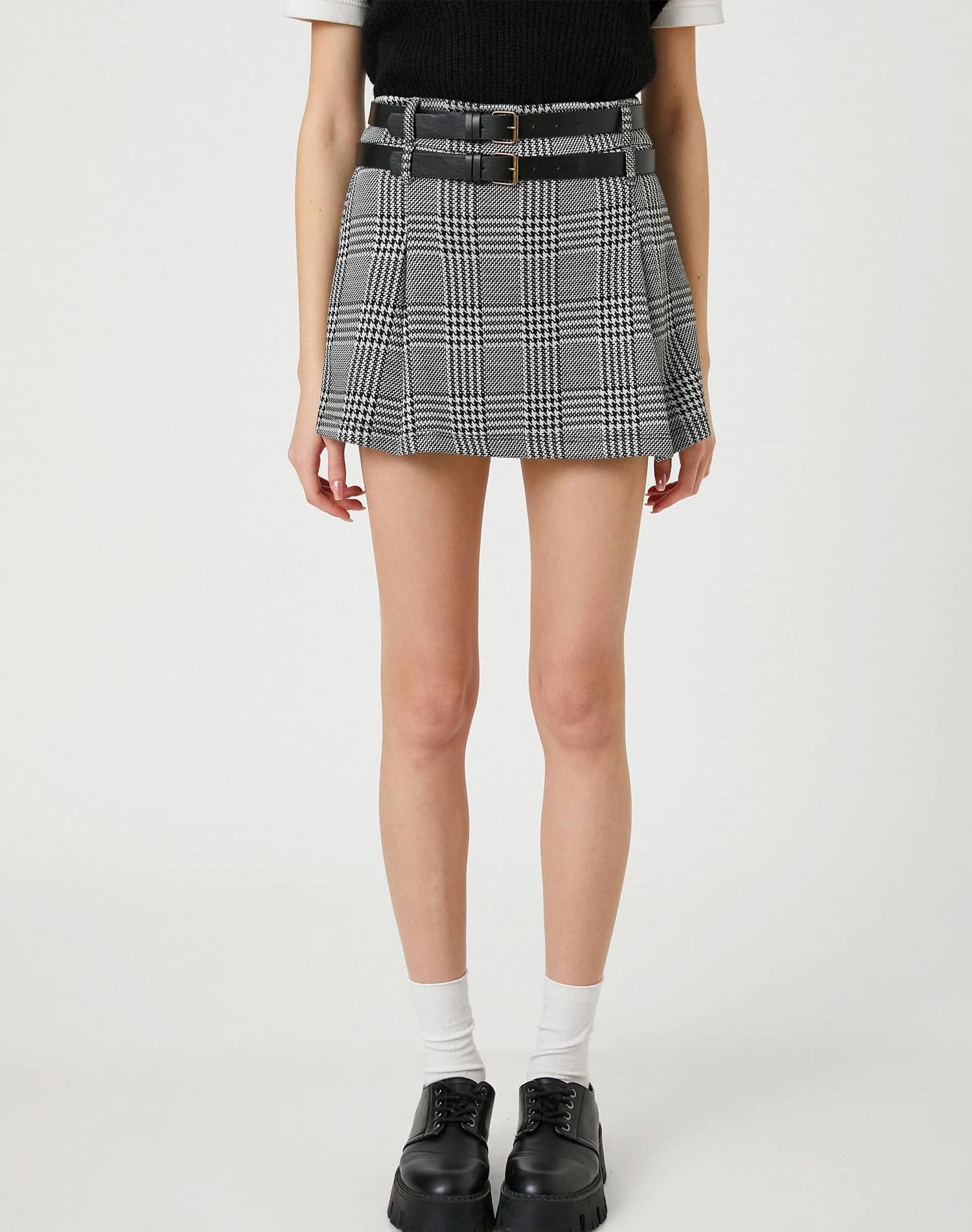 Short Skirt Double Belt Detailed Wide Pleated